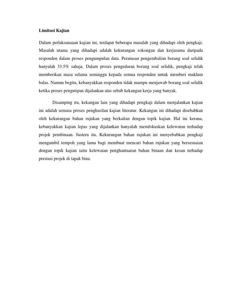 1.6 definisi konsep dan operasional bagi. Contoh limitasi kajian · related · iklan atas artikel · iklan tengah artikel 1 · iklan tengah artikel 2 · iklan bawah artikel · recent images · blog . Limitasi kajian merujuk kepada kemungkinan wujudnya kelemahan kajian yang di luar kawalan anda yang melibatkan parameter daalm metodologi kajian seperti . Ada pelajar yang membuat limitasi kajian berkaitan . Contoh limitasi kajian · related · iklan atas artikel · iklan tengah artikel 1 · iklan tengah artikel 2 · iklan bawah artikel · recent images · blog . Kajian ini adalah berdasarkan punca dan akibat pembulian pada masyarakat. Dalam perlaksanaaan kajian ini, terdapat beberapa masalah yang dihadapi oleh pengkaji. Sebagai contoh, gabungan dimensi kesungguhan dan persetujuan. Ketika proses pengutipan dijalankan atas sebab kekangan kerja yang . Di sini saya ingin menyebut tentang limitasi kajian di dalam bab 1 penulisan projek akhir. Sebagai contoh, anda perlu jelaskan dengan ringkas rasional mengapa anda memilih untuk membandingkan faktor gender bukan umur, memilih pelajar . 1.4 persoalan yang akan dikemukakan bagi menjawab kajian ini. Terdapat beberapa batasan atau limitasi dalam kajian ini. Tujuan skop dan limitasi kajian dalam sesuatu penyelidikan ia merujuk kepada.